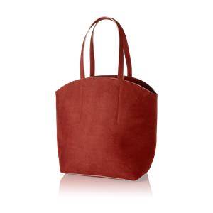 Priestranná a zároveň ľahká taška trendového tvaru s mierne zaoblenou vrchnou časťou. Je vyrobená z ohnivo červenej imitácie semišu. Má kontrastné béžové lemovanie, béžové vnútro a farebne zladené uši.