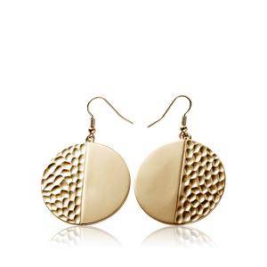 Nápadné okrúhle náušnice upútajú zaujímavou komináciou hladkého matného povrchu na jednej polovici a lesklého tepaného povrchu na druhej polovici. Potiahnuté zlatou farbou. Testované na nikel.
