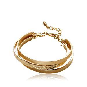 Honosný zlatistý náramok pozostáva z troch obručí spojených retiazkou. Zdobí ho kombinácia dvoch rôznych povrchov - matný a lesklý s atraktívnym tepaným vzorom. Má karabínkové zapínanie. Testovaný na nikel.